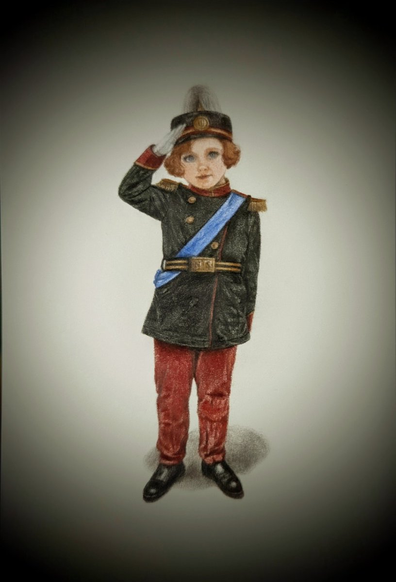 こんばんは。 敬礼をする女の子の絵を描きました✏️深緑色で服を塗ったのですが、写真で撮ると黒くなってしまいました。 #色鉛筆画 #絵描きさんと繋がりたい #少女 #軍服