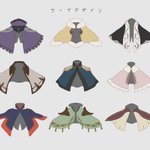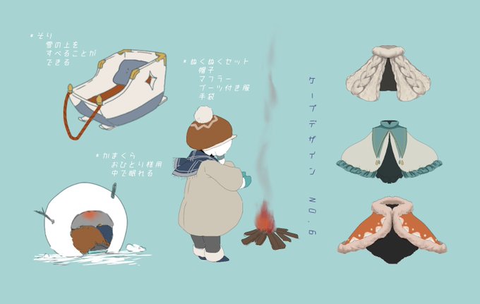 #sky星を紡ぐ子供たち #skyイラスト *✧星の子冬支度*✧ マフラーと帽子こんなのかな、という想像と、暖かそうなもこもこケープたち。もこもこ大好き ソリに乗って遊んでほしい かまくらたくさん並んでたらかわいい