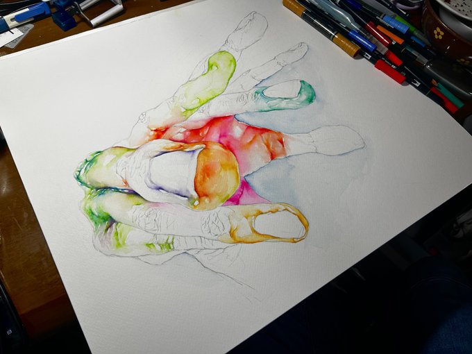 新しい画材を過去一でかい絵で試しました。今までの様にはいきませんね・・・ #水彩