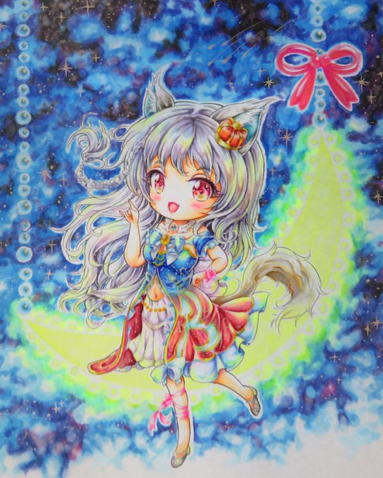キャラクターの色塗りは凡そ完了。あとは手描き派のハードルの一つでもある背景。オリジナルの幻想的なまでに美しいステージの雰囲気を自分のタッチでどこまで表せるか??チャレンジ!! #白餅だんご #コピック #手描きイラスト