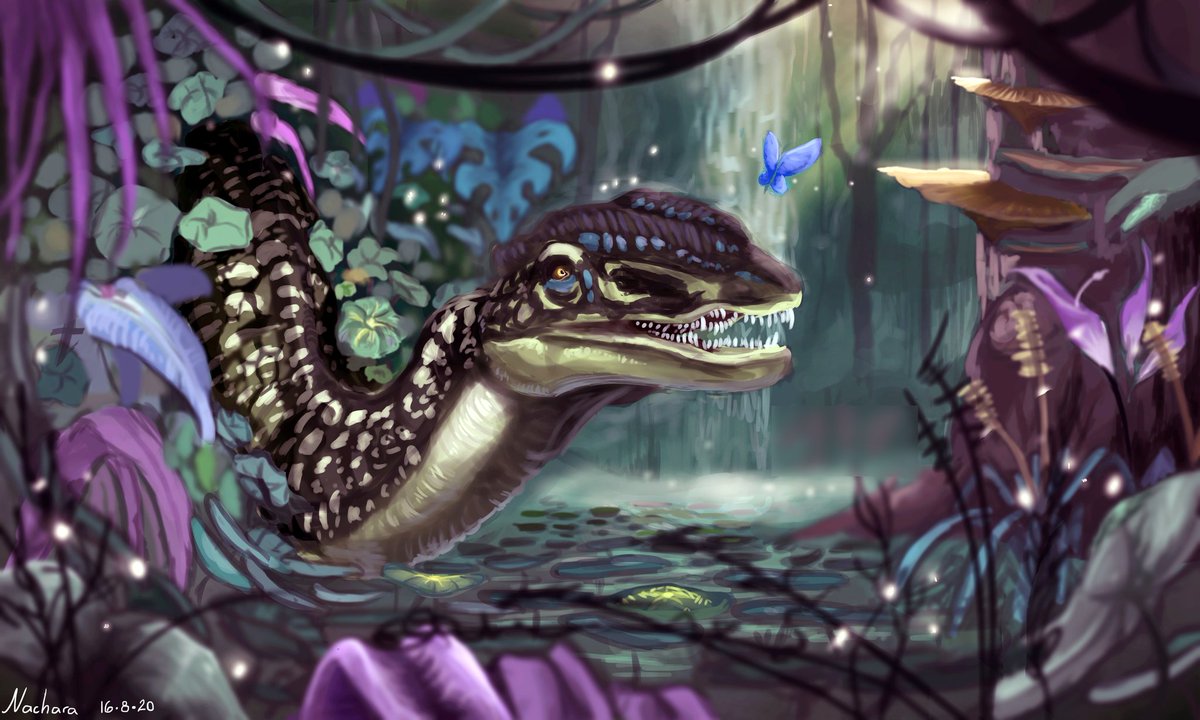 Alpine Novaraptor Whew, backgrounds are a struggle. Painting feathers was the only thing keeping me moderately sane throughout this process.. Completed using MediBang, February 2021 #primalcarnageextinction #primalcarnage #dinosaur #novaraptor #digitalart #MediBang