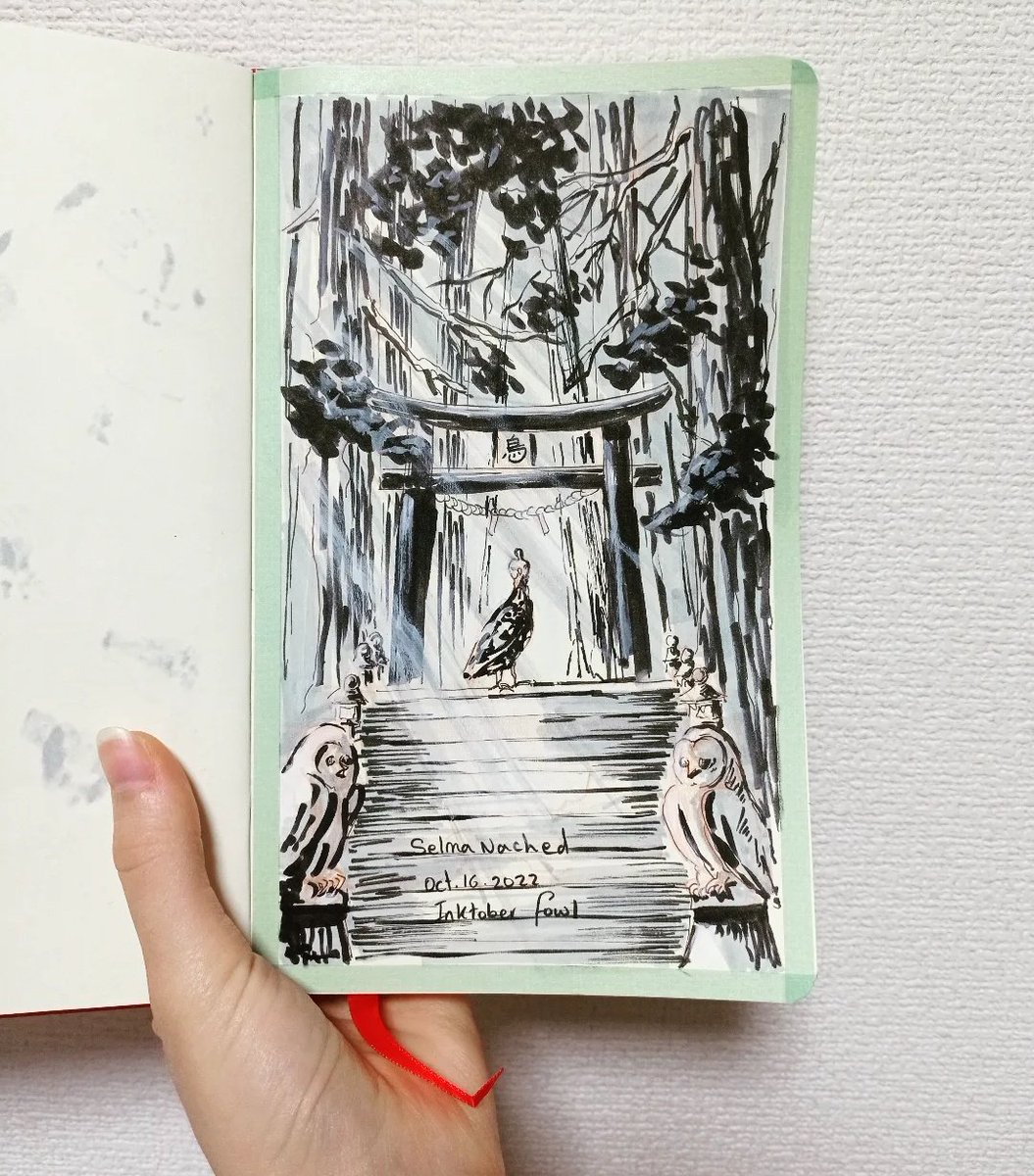Inktober day 16 Fowl #inktober2022 #ink #inktoberchallenge #blackink #illustrator #illustrationartist #art #drawing #fowl #japan #shrine #diety #owl #forest #神社 #鳥 #illustration #inktoberoftheday #artist #artwork #日本 #sketchbook #イラスト #梟 @inktober