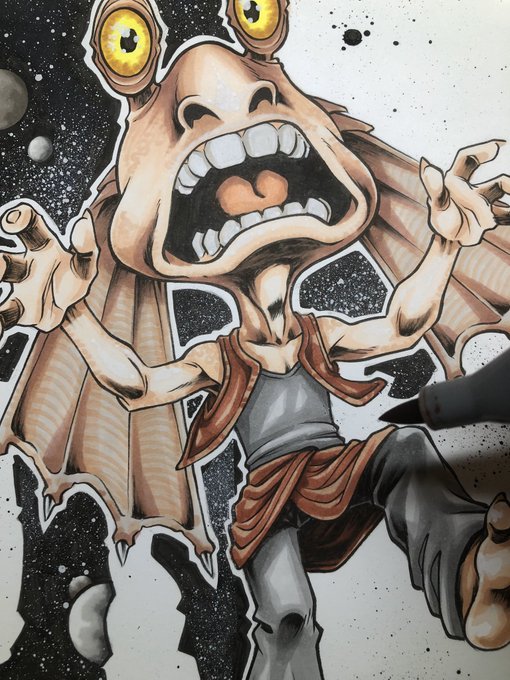 Wip 02 /No. 24 / Coloreando el Inktober2019 / Star Wars #jarjarbinks . YA PODÉIS DISFRUTAR de todas las recompensas en el Crowdfunding del #artbookinktober2019 con la plataforma #verkami basado en personajes de #starwars : vkm.is/inktober2019 #inktober #inktober2019 #colour