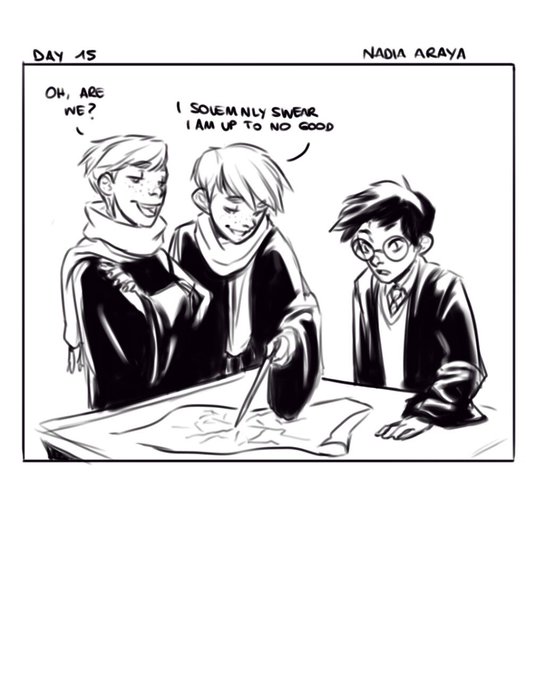 Day 15~ "I solemnly swear I am up to no good" Fred and George passing the marauders map to Harry~ #fantasy #digital #digitalink #digitalart #day15 #inktoberday15 #inktober #nadiaarayaart #fanart #pottertober #harrypotter #fredweasley #georgeweasley #fredandgeorge #maraudersmap
