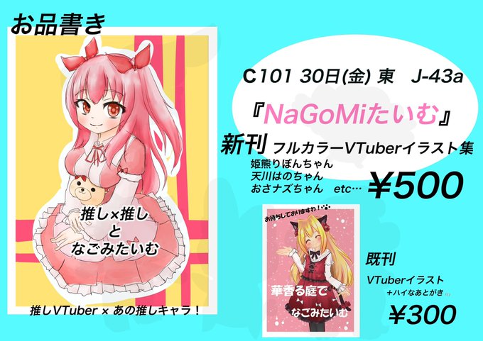 コミックマーケット101お品書きです! 推しVと公式を待ってるので?大きい声では言えない?あのキャラを一緒に描いてます! 12/30(金) 東 J-43a 【NaGoMiたいむ】でお待ちしております! C97の初参加時の初々しい?本も少しだけ… #C101 #C101お品書き