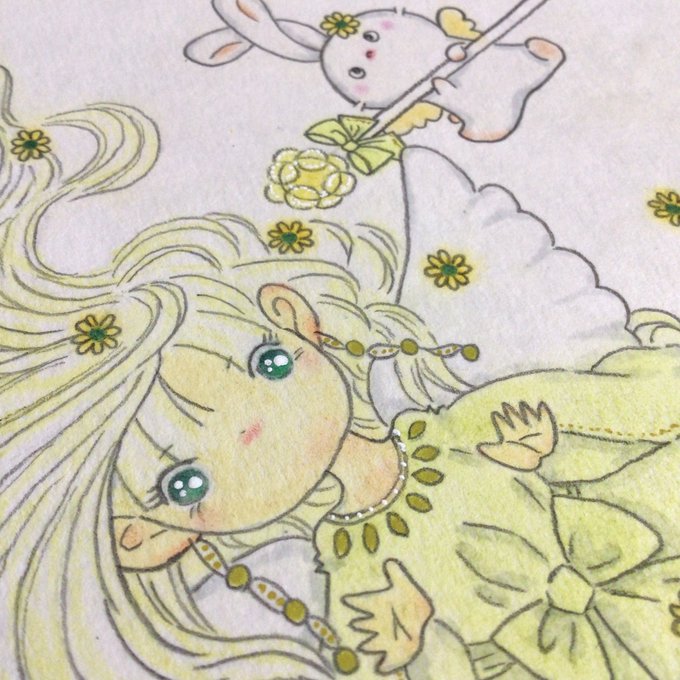 シリーズ「無謀な挑戦❣️県美展」クリーム色のうさぴょん妖精ちゃん♡何かを持って懸命にしてますが・・・何でしょね😕!!!#イラスト好きさんと繋がりたい #アナログイラスト #絵柄が好みって人がいればいいなぁ