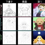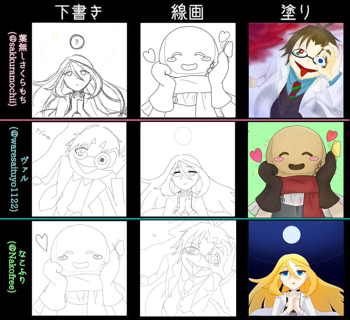 3 3 絵が超絶うまい私のお友達2人と、殺戮の天使でラフと線画と塗り交換するやつやった!!!!! 企画乗ってくれてありがとう!!!! (私が描いた3枚) 22/11/16 21:38