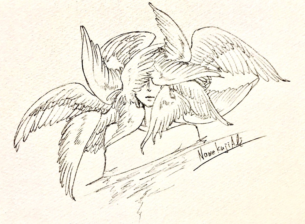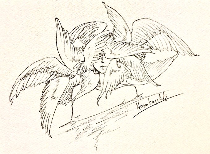 「隠す」 とある都では、頭部に羽が生えている羽人という種族がいたらしい。 昔は多くの羽人がいたが、「彼らの羽が妙薬になる」と根も葉もない噂により多くの羽人が被害に遭った。 今では羽人を都で見かけることはできない。 #創作 #オリジナル #お絵描き #アナログ絵 #ペン画