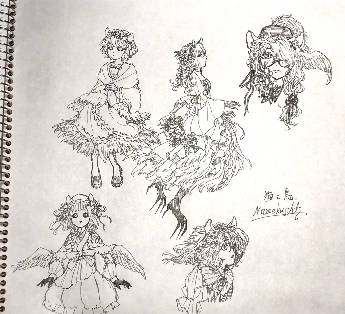 絵リハビリ。 猫と鳥をテーマに久々にアナログ絵を 描きました #創作 #お絵描き #ペン画