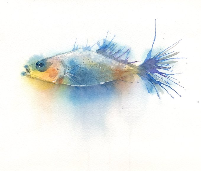 今日の水彩。 淡水魚ちゃんリベンジ。 ぼかしで色が流れるのは食いとめたけど、 そもそも濃い色を置く思いきりが、まだ弱い🤣 薄い色重ねる塗り方してきたからなぁ🖌 #水彩 #水彩イラスト
