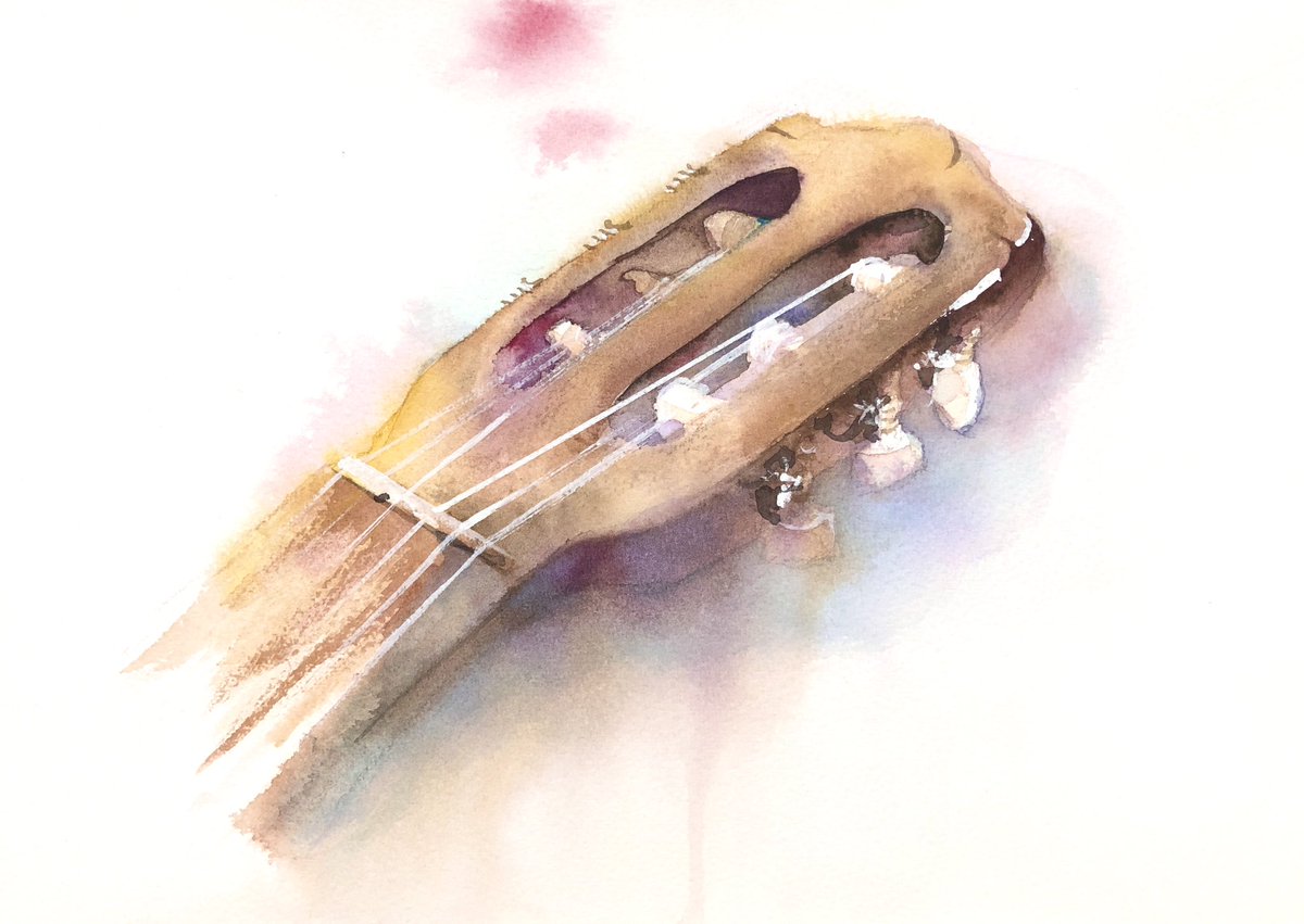 今日の水彩画。 ギターちゃん🎸 やっと濃い色が入れれるようになってきた☺️ エッジとって片ぼかしとか、禁じ手かなぁ? と思ってたけど、そうでもなかったぽい。 やっぱり影は紫が好き🎶 #水彩 #水彩イラスト #ギター