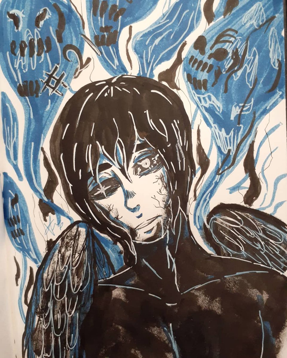 Vigésimo primeiro dia : anjo caído Tentei me inspirar em "all the good girls go to hell" da Billie eilish, mas errei na hora de parar, fi, um fundo horrível, tentei arrumar, e o desenho ficou muito poluído. . #inktober #inktober2019