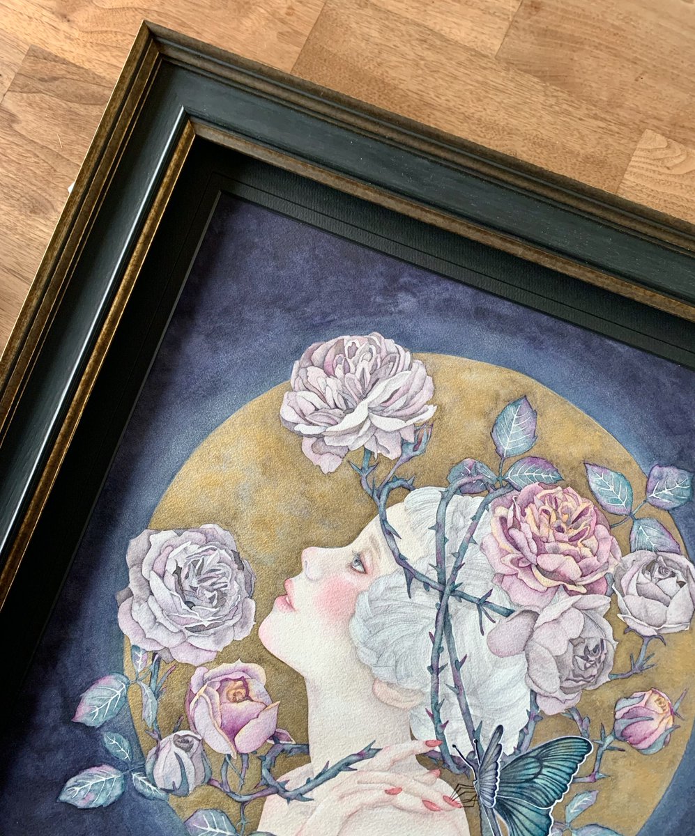 額入れ準備中。 これも本当は年末年始にゆっくりやろうと思いつつ、体調不良で出来ていなかった事。画像は未カットの絵の上に額を乗せているだけの状態ですが…額とマット(中の絵に合わせた厚紙)が最強にかっこいい! 嬉しい♡ そして画像、割と本来の色味に近く撮れました♡ #絵描きさんと繋がりたい twitter.com/HaNao678/sta…
