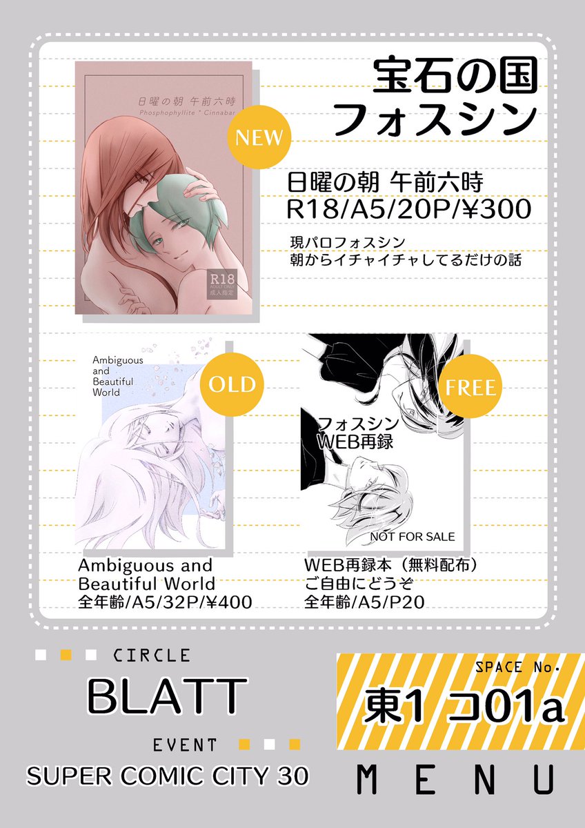 5月4日スパコミお品書き 東1ホールコ1a 「BLATT」 新刊の他既刊と無配本持っていきます 無料配布はTwitter掲載漫画の再録です 新刊サンプルは引リツ参照 開場後1時間程離席予定ですので本人にご用の方はお昼以降会いに来て下さると嬉しいです😊 twitter.com/naruminlustrou…