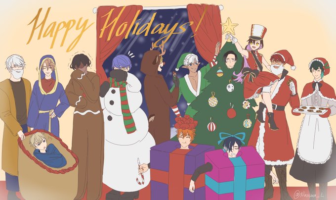 Belated happy holidays!! Here's a lovely holiday photo ~ The nativity scene parody is probably one of the most unhinged things I've ever drawn. 💀💀💀 #obeyme #obeymefanart