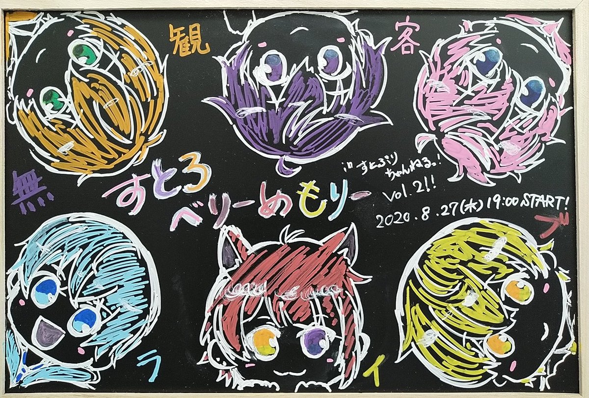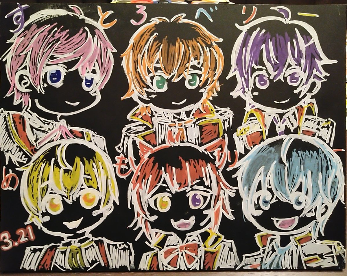 すとぷり配信が今日ということで急遽描いてみました! お店に飾ってます〜 喜んでいただけたら本望です^^* こちらには前回のも載せておきますね お好きな方に届け〜 #すとぷり無観客ライブ生配信 #すとぷりファンアート #すとぷりギャラリー #ブラックボード #手描き