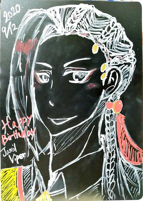 ジャミルぅうううううううううう!!!!! 誕生日おめでとう!!!!!!! 文字書くスペース空けるの忘れて描いちゃったから、上に被っちゃったけど許してくれな!!!! おめでとう!!! #ジャミル・バイパー誕生祭2020 #ジャミル・バイパー生誕祭2020 #ツイステファンアート #ブラックボード
