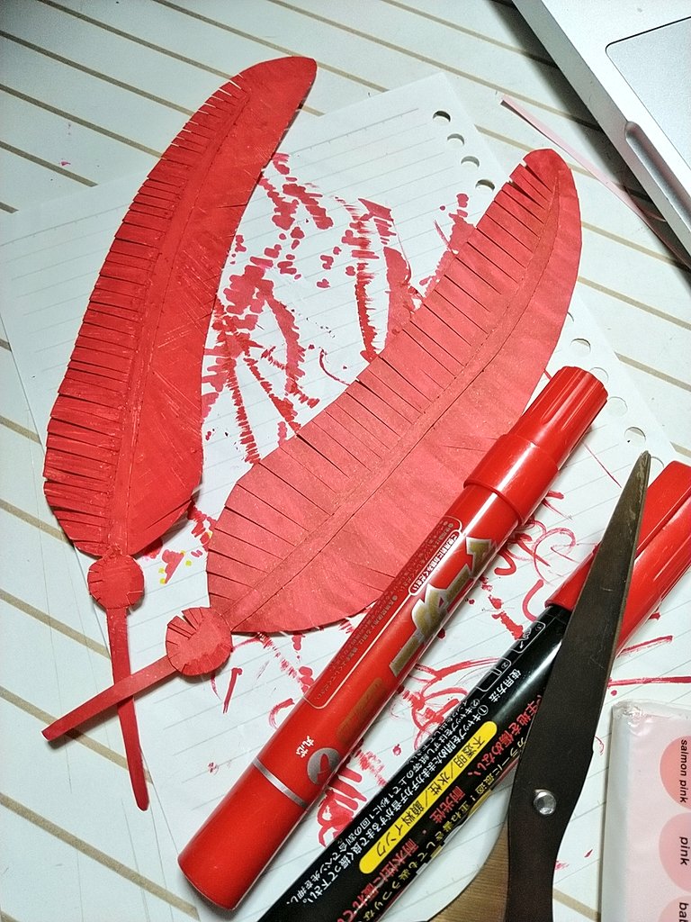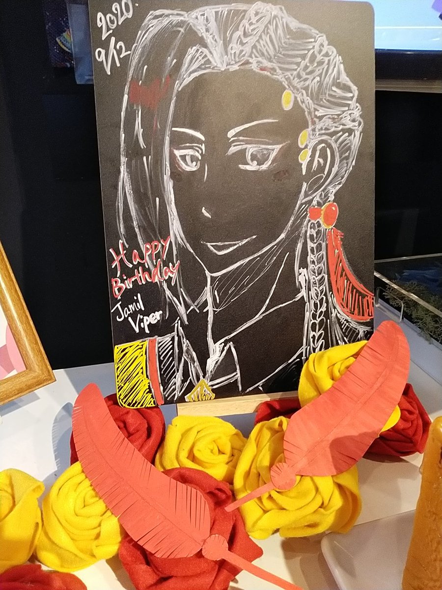 久々に羽根作ってみたけど、赤い画用紙切らしてたので赤ペンで塗った…💦 お店にも設置完了!!!! おめでとうジャミル!!!! #ジャミル・バイパー生誕祭2020 #ジャミル・バイパー誕生祭2020 #ジャミルのドッカン一番乗りバースデー #ジャミル生誕祭2020 #ツイステファンアート #ブラックボード
