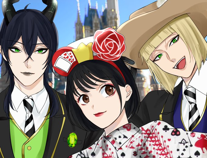 30日に🏰で竜の君と監督生くんが遊んでくれたよ! 3人で映っている写真を上げたかったけど代わりに絵で表現。 メルシ〜✨本当に楽しかったよ!