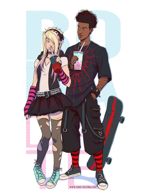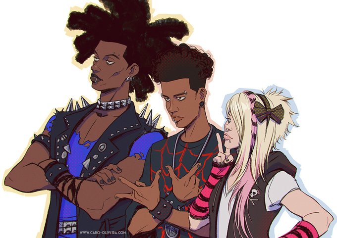 Hobie Brown influenced Miles and Gwen to follow their inner punk. Yes, Gwen is wearing late 2000's scene/emo #AcrossTheSpiderVerse