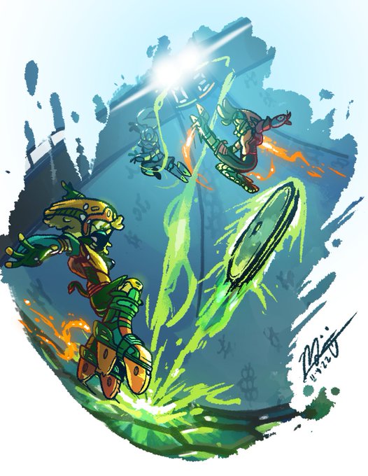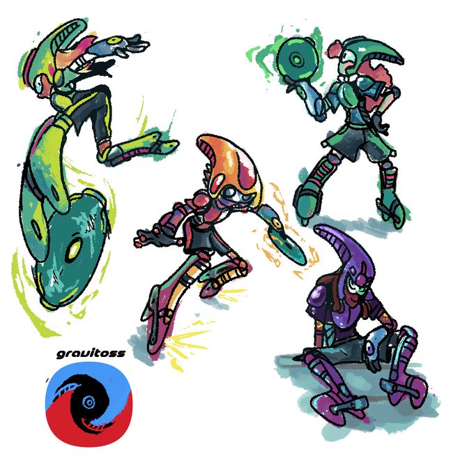 FINALLY. Some action! Wanna know how future frisbee works?? Imagine a team based Lethal League match mixed with inline skating all across a 3D anti-gravity spherical arena. #DigitalArtist #worldbuilding #digitalillustration