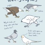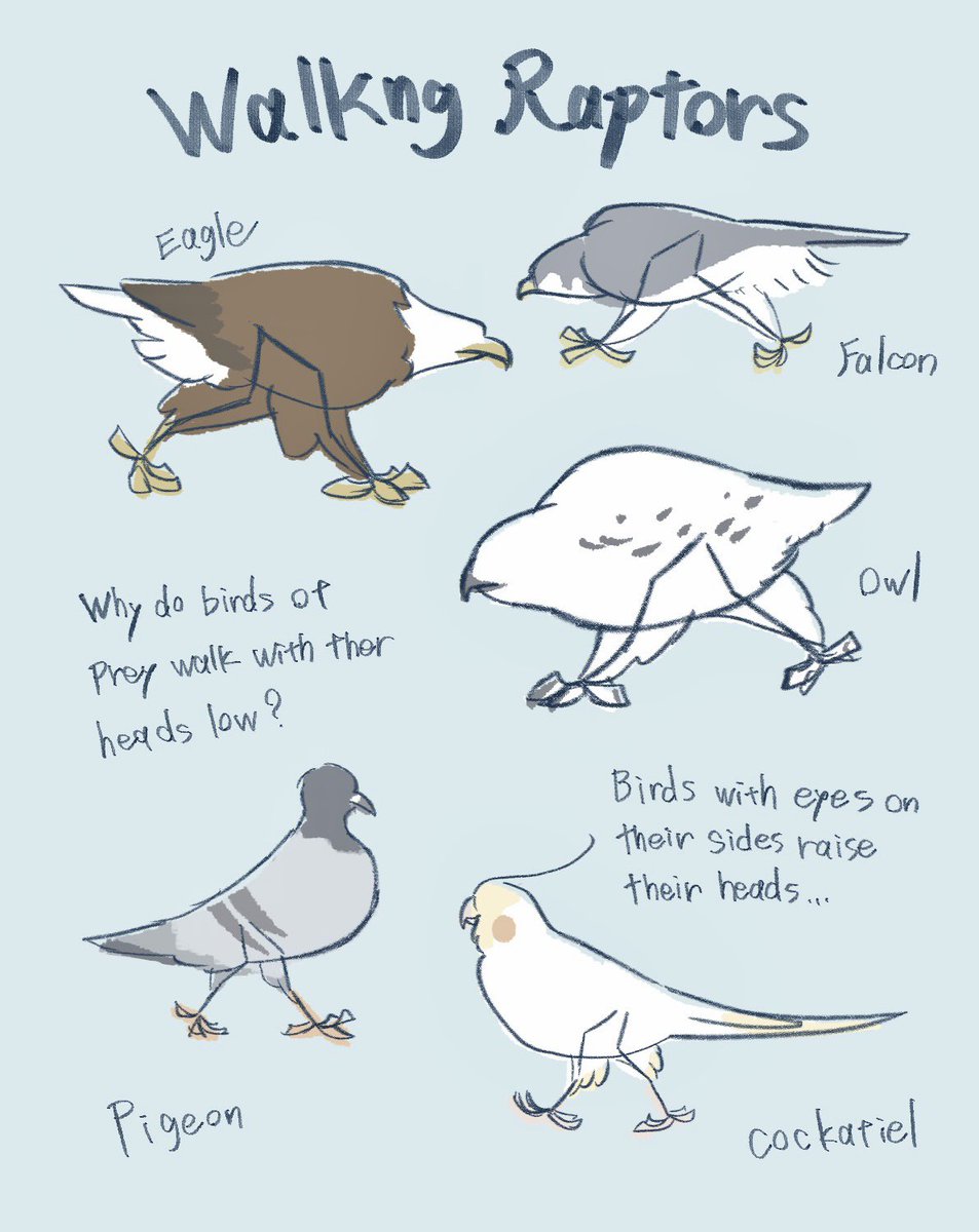 なんで猛禽って肩より頭低くして歩くんだろうね。首や足が短くて目が正面についてるから?インコは首や足短いけど目が横についてるから頭上げて歩くよね。