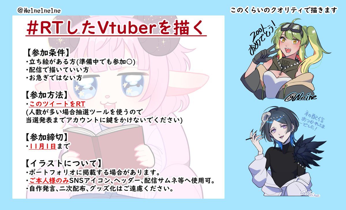 【タグ】 配信・動画:#今日のネイネ ファンアート:#ネイネの肖像 使用可能FA:#また見てネイネ 【YouTube】 youtube.com/channel/UCc2Ki… 【マシュマロ】 marshmallow-qa.com/ne1ne1ne1ne 【ご依頼等】 nizima:nizima.com/Profile/80298 BOOTH:neinesshop.booth.pm Skeb:skeb.jp/@Ne1ne1ne1ne