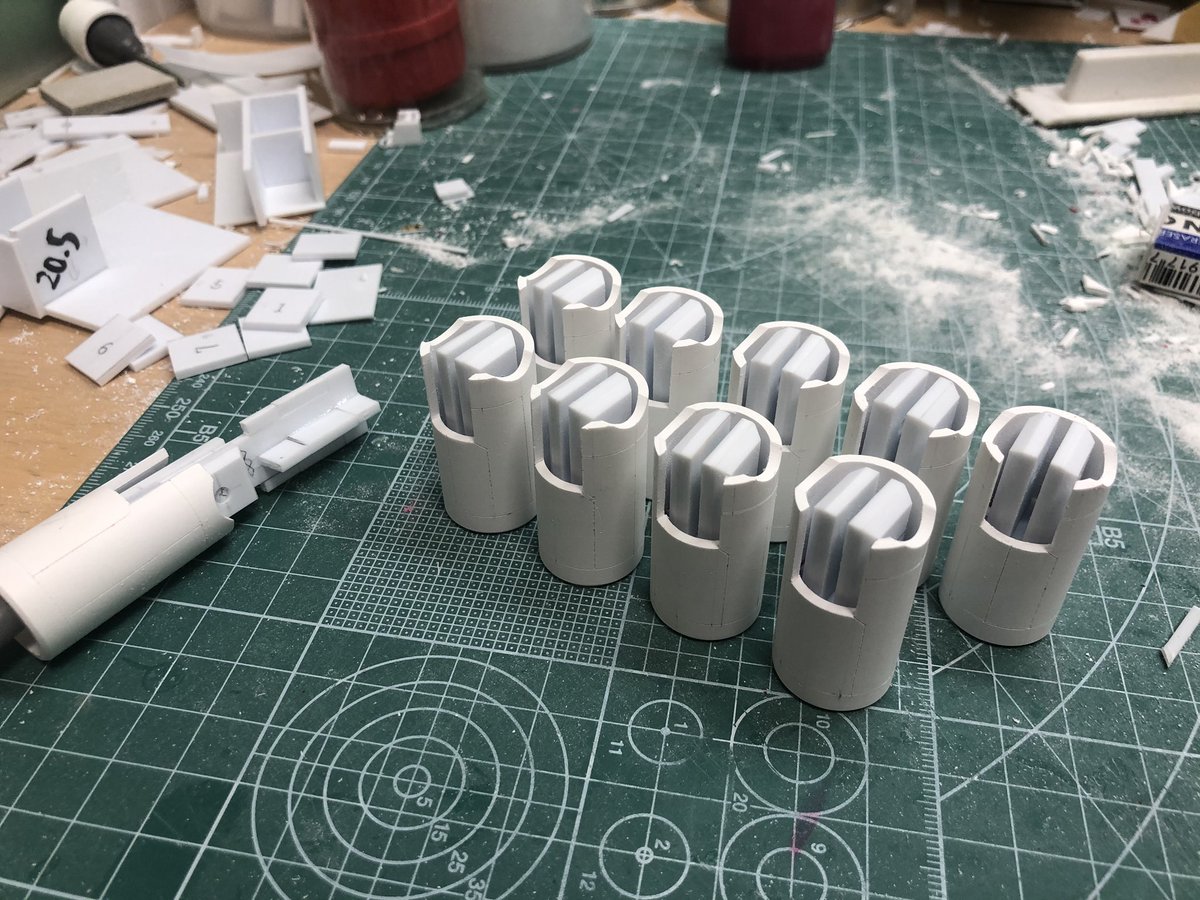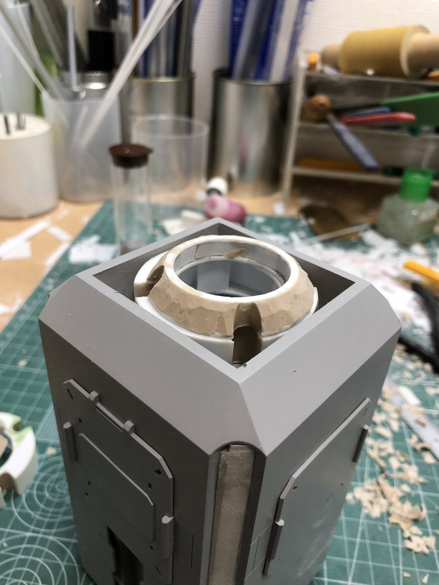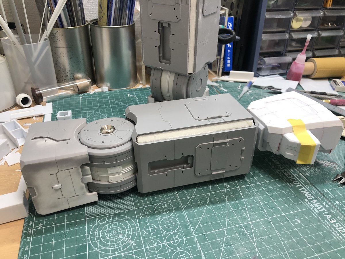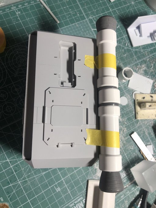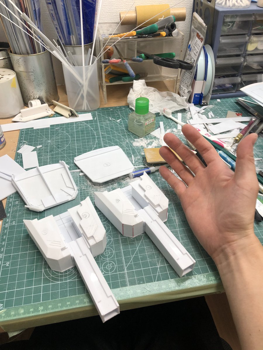 5 33 1/35タコザク 腕のエンジン製作中。 こんな感じで行こうと思います。 #ガンプラ #プラ板 19/08/25 18:49