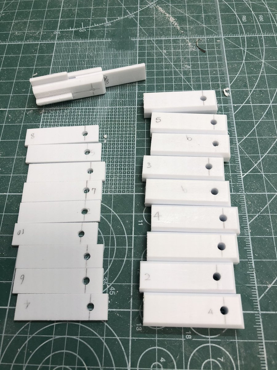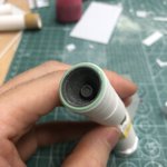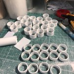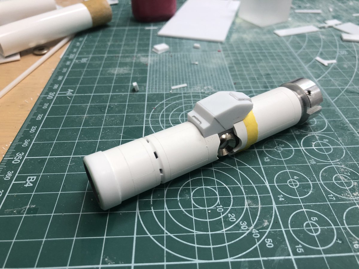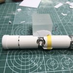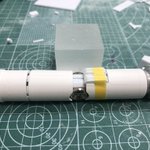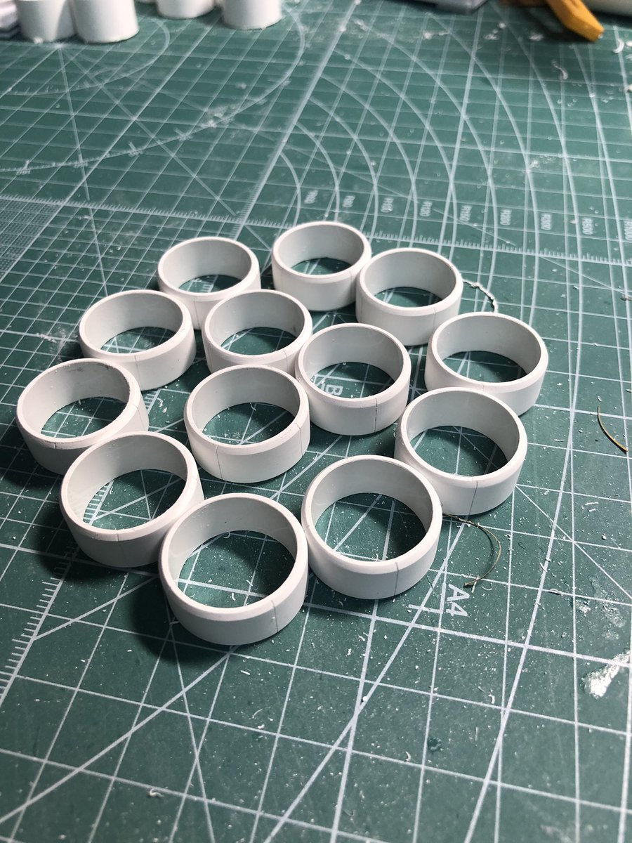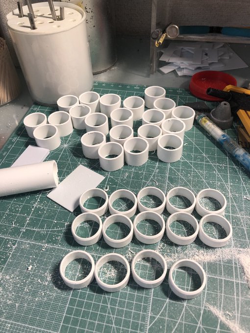 14 60 1/35タコザク 腕エンジン部分 短いパイプのパーツを16個作製 筋彫りは流石にテープで掘るとだるいので、治具を作製。 #ガンプラ #プラ板 19/09/01 18:40