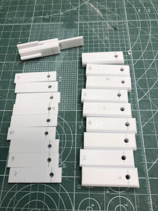 1/35タコザク 腕エンジン部分 短いパイプのパーツを16個作製 筋彫りは流石にテープで掘るとだるいので、治具を作製。 #ガンプラ #プラ板