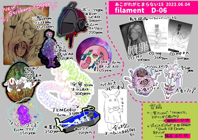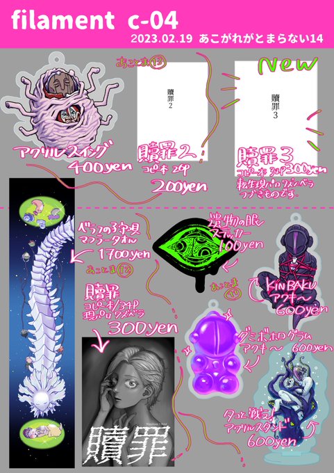 24 43 直前の発表! 新刊は32pのコピー本『贖罪』の3話めのみ ツリーにサンプルつけます⤵︎ (発注日間違えて新作が届きませんでした!) 既刊とグッズ類は少しだけです 本日はよろしくお願いします 23/02/19 09:01
