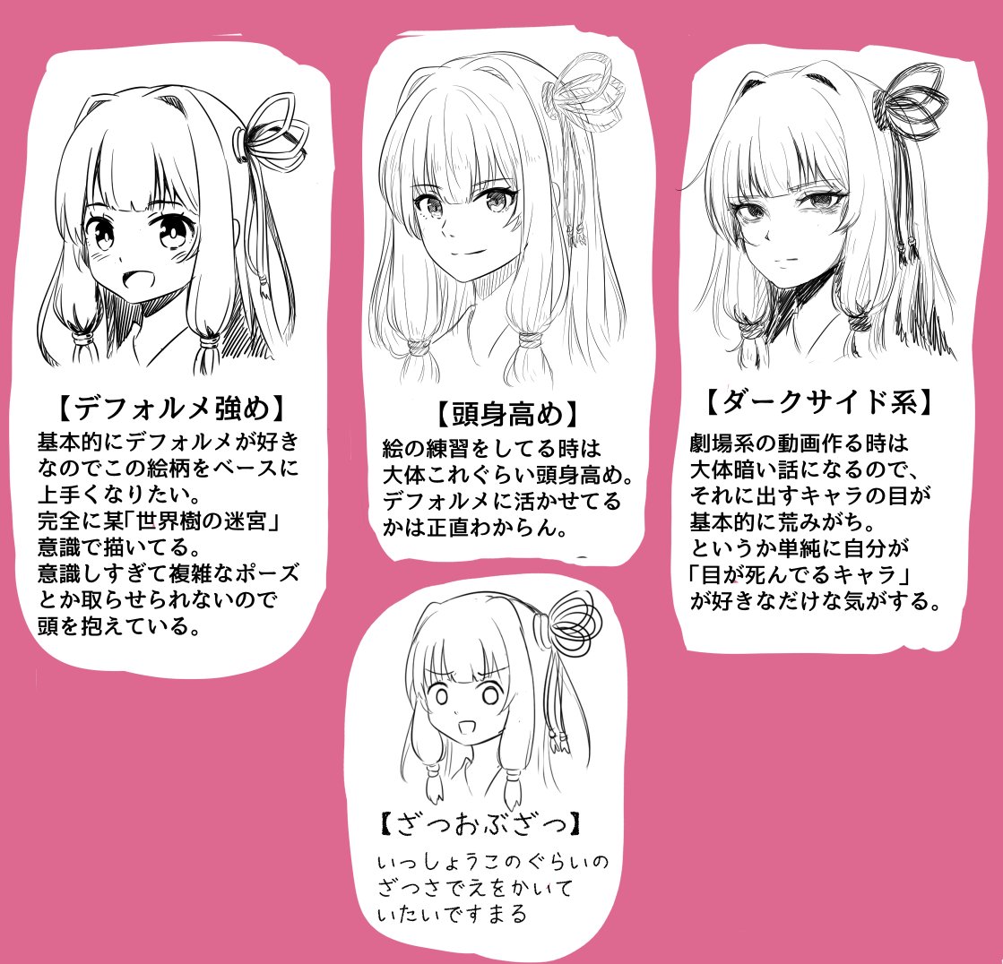 自分の絵柄が安定しないのでよく描く絵柄を大まかにタイプ分けしてみる。 デフォルメ以外描く時は顔ぐらいしか意識して変えてないけどね……。