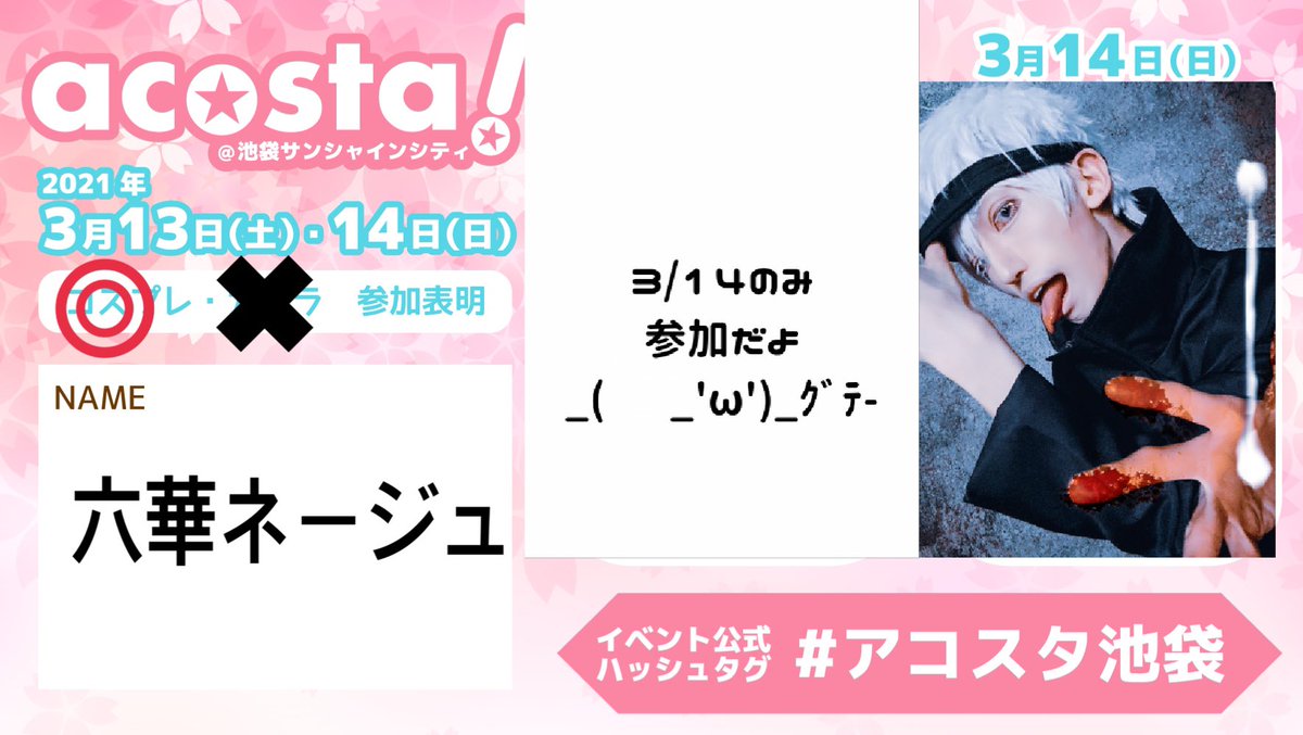 ①六華ネージュ(ろくはな ねーじゅ) ②呪術廻戦 ③五条悟(シーズン2オープニングの青い花束仕様) ④10/30 11:45or12:55どちらでも可能 ⑤人生初の池ハロ👏🏻思い出作りとイベント盛り上げ貢献のシナジー効果の領域展開を開きましょう🤞😎 #池ハロ #池ハロ2021 #イケサンランウェイ2021
