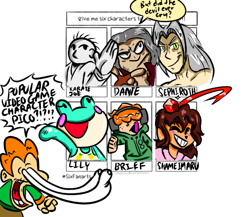 Here are my #SixFanarts #SixFanartsChallenge Brief- @flimwhitei Karate Joe- @Person_the_53rd Sephiroth- @PlantIsSlant Lily- @PleaseHugMeSoon Dante- @aurawada Fuck you @ShadySteg for giving me the most complicated haired character in the entire damn universe