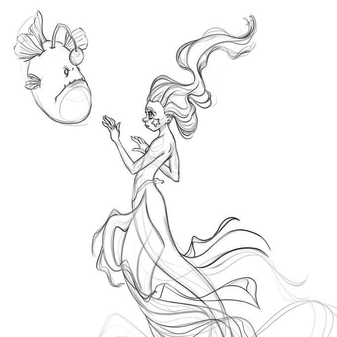 A sketch of the new #mermaid I'm working on. Do you think the mermaid is right to approach the lantern fish ? I'm not sure, he does not look friendly... #mermay #oc #sketch #doodle #art #illustration instagr.am/p/CdYVZRNjRMP/