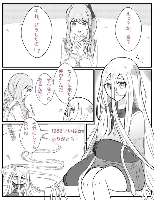 1いいねにつき1cm髪が伸びた奏 #prsk_FA #宵崎奏 #暁山瑞希 twitter.com/Nekomaru_suk…