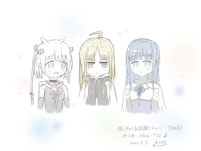 13 46 推しキャラお絵描きチャレンジTAKE3 #マギレコ 初代みかづき荘組です!こういう絵柄も描いてみたかった。ガチャ応援感謝企画?で描かせていただいたものを再掲~ やちよさんが一番難しかったです💦 年長者とか家族じゃなくて、同年代の仲間として……たまにイベントに出てきては泣かせてくれます😢 22/09/08 17:45