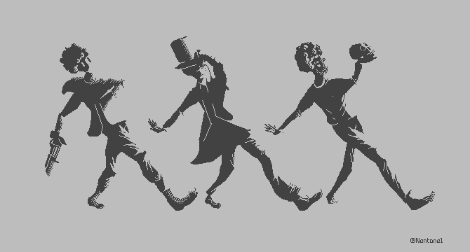 Dear Me, 1920s Noir Detective (WIP): Blocking Phase. Not the usual 1-bit. But who can blame you branching out and experimenting with a monochrome palette. Can't wait to see how you mess this up. #pixel_dailies #pixelartwork #ドット絵 #aseprite #sir_nentone