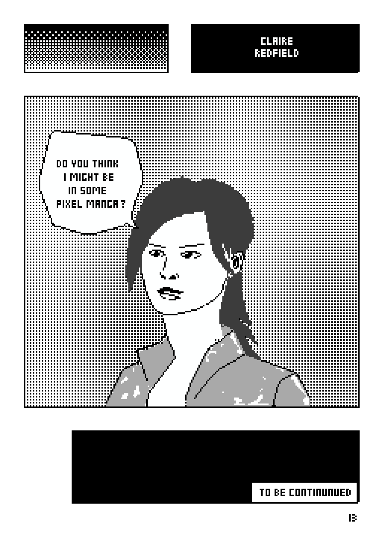 "Claire Redfield" -- Mockup #manga page in #pixelart form. #ドット絵 #aseprite #sir_nentone @1bitbadbitches #residentevil2remake #ResidentEvil #mangaart #mangadrawing @palehandgame