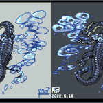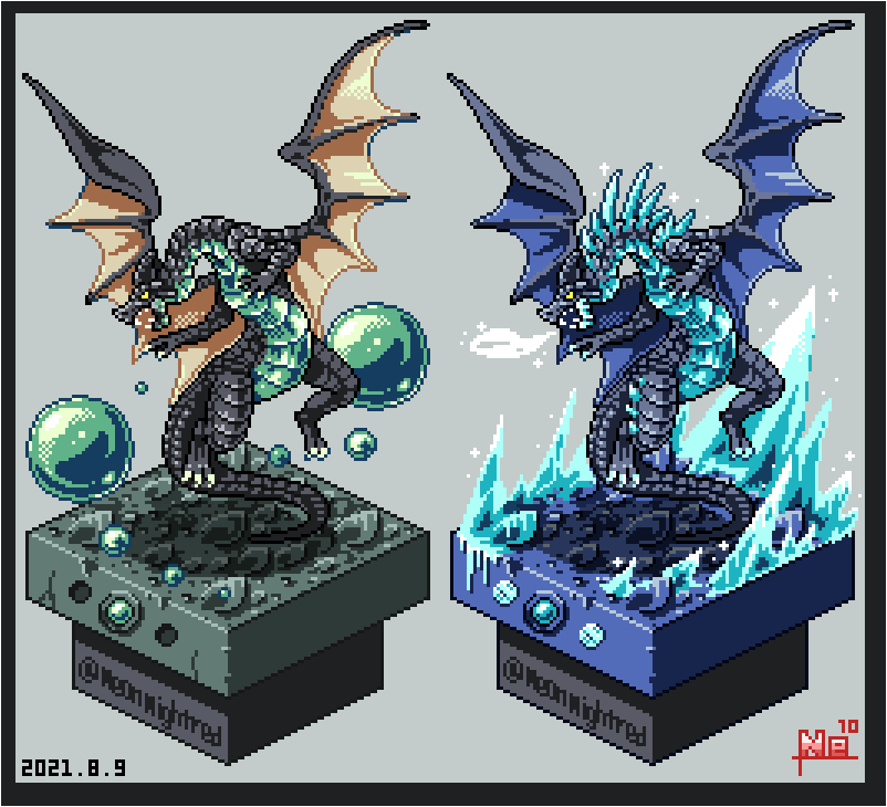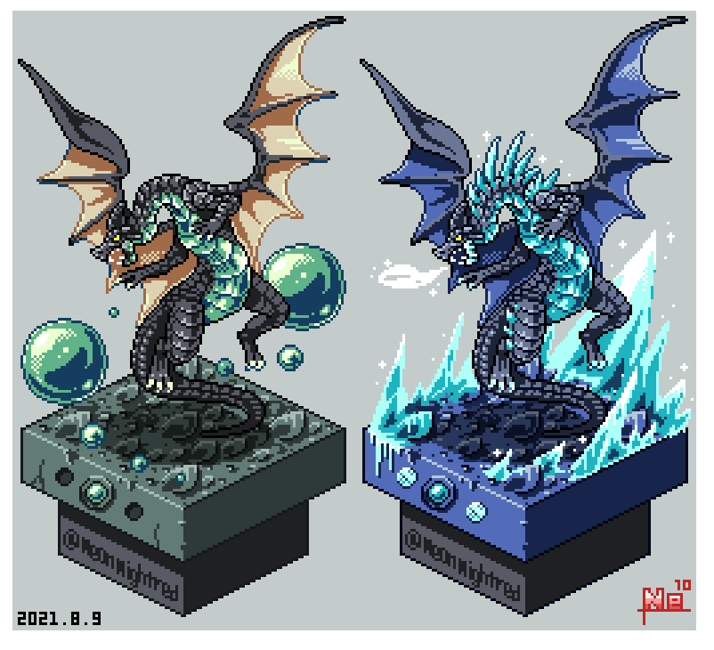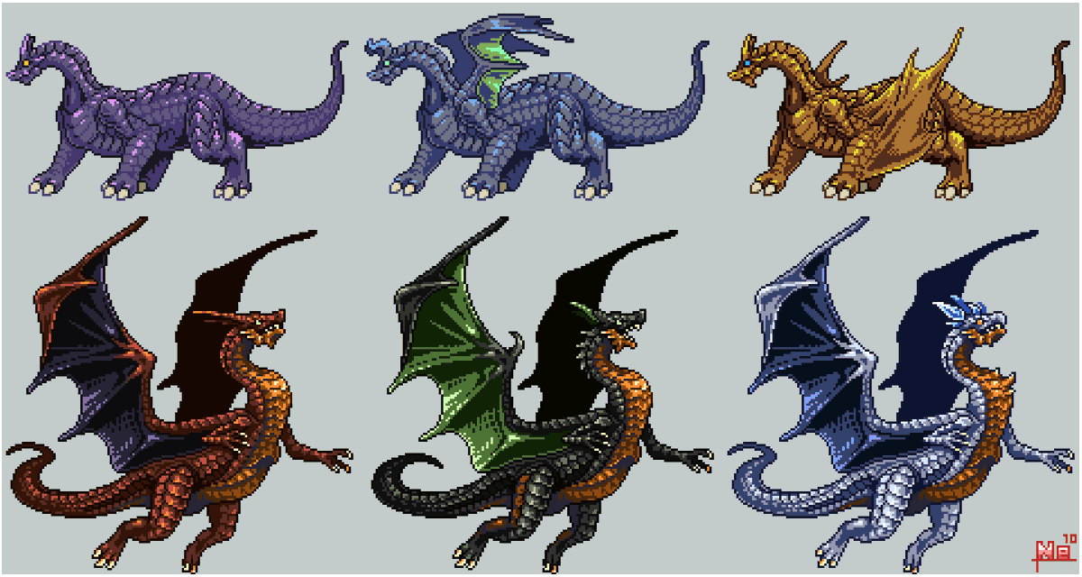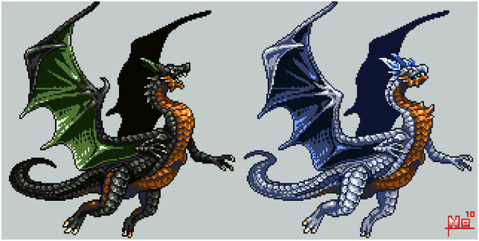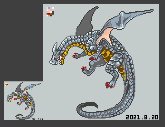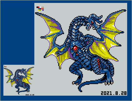 #よその子のカラーパレットでドラゴンドットを打つ #ドット絵 けーぴさん(@keepi0103 )からお借りした色でドラゴンドット打ちましたー! 淡い感じの色を普段使わないので楽しかったです! 胴体の青系部分の影色はズボンのグレーを使ってみました。 ありがとうございました!!