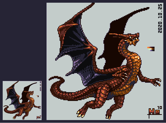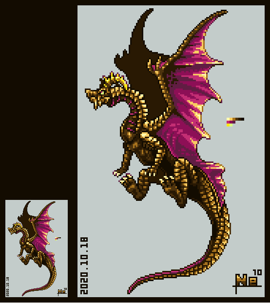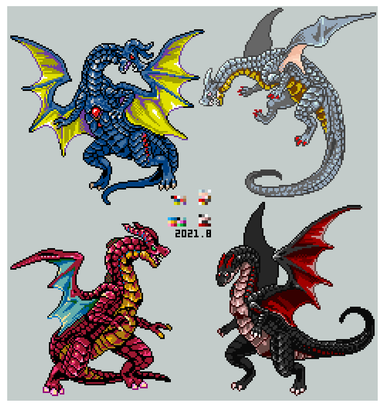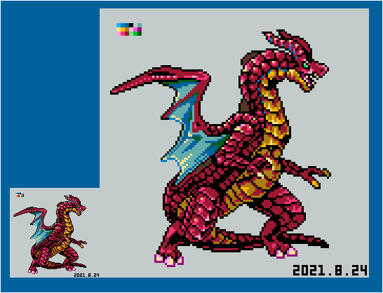 #よその子のカラーパレットでドラゴンドットを打つ #ドット絵 mozyapeneさん(@mozyapene )からお借りした色で打ちました。 色数が豊富なのと,彩度の高い色が多くて配色を考えるのが大変でしたが楽しかったです!(なんとか全色使いました) ありがとうございました!
