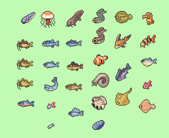 Here's a whole bunch of the fish I made for the new Dwarf Fortress launch! I did a whole bunch of the animal, animal people & monsters.