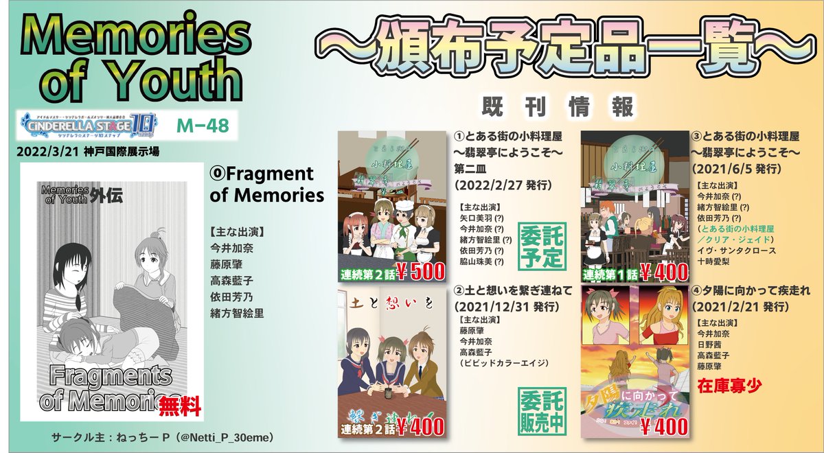 #シンステ #cin_stage 出発前に最後の告知です。 無料頒布のペーパーと、準新刊+既刊4種を用意しました。道中お気をつけてお越しください。それでは会場で会いしましょう! #今井加奈 #矢口美羽 #緒方智絵里 #依田芳乃 #脇山珠美 #藤原肇 #高森藍子 #日野茜 #イヴ・サンタクロース #十時愛梨 twitter.com/Netti_P_30eme/…