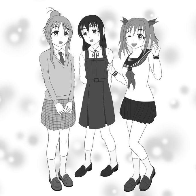 #みなさん去年の今頃はどんな絵描いてましたか ジャンスカ肇ちゃんを描いてたら、いつの間にか藍子ちゃんも加奈ちゃんも描いてました。 もうあれから1年経つのか。 じゃあ彼女らも17さ…🤛ボコッ …いや16歳だよね! #ビビッドカラーエイジ #藤原肇 #高森藍子 #今井加奈