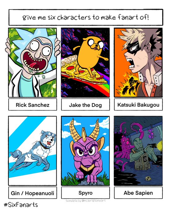 SIX FAN ARTS CHALLENGE 2! I really love this one :) This template & art challenge was created by @mcapriglioneart #sixfanarts #art #artchallenge #digitalart #procreate #rickandmorty #ricksanchez #adventuretime #myheroacademia #hopeanuoli #ginganagareboshigin #gin #hellboy