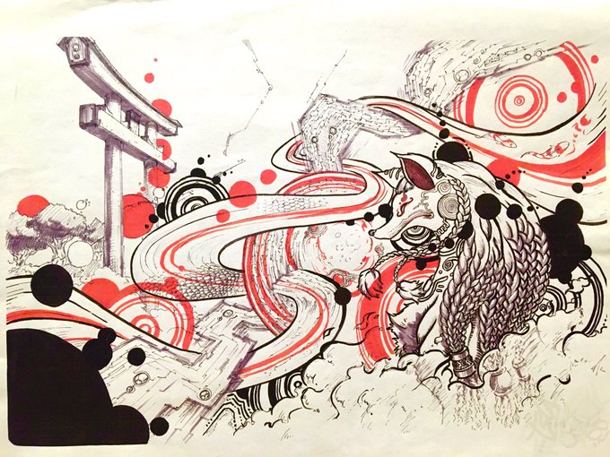 少し前、部屋の整理をしていた時に出てきた高校の時に #描いた #イラスト #ペン画 #筆ペン #お稲荷 #鳥居 #空想画
