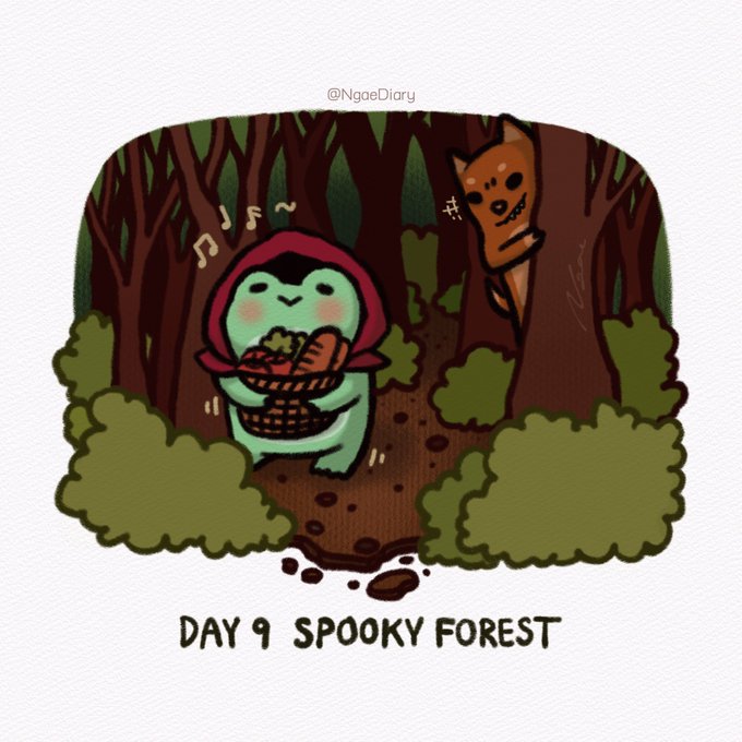 DAY 9 - Spooky Forest #froggyfall Froggy red riding hood on the way to see grandma~ #procreate #digitalart #Illustrations #inktober #inktober2022