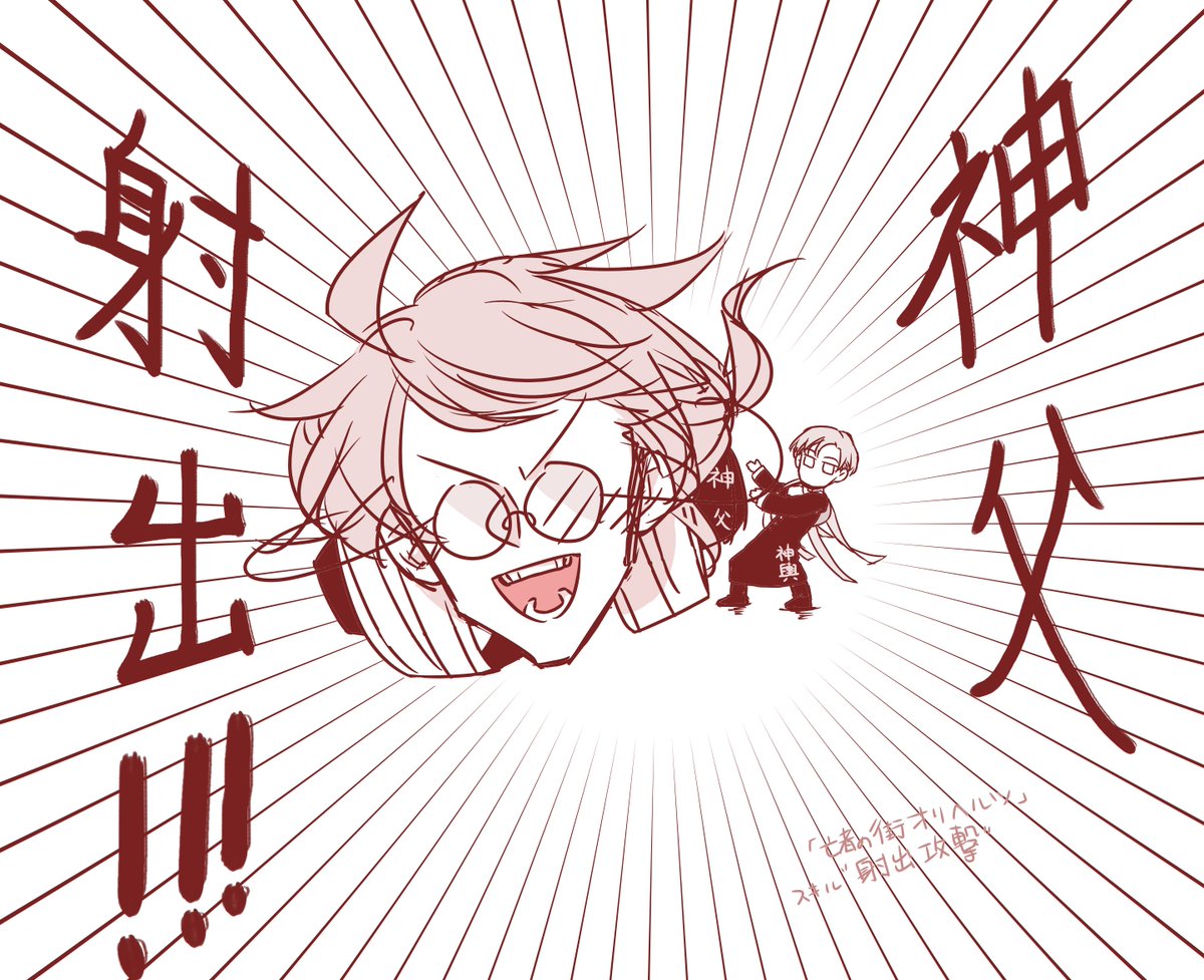 #イラスト #オリキャライラスト 「亡者の街オリヘルツ」Lv7スキル射出攻撃 ということで神輿(しんよ。奥)に射出される神父は絶対楽しそうの図 神輿「よ…いしょ」 神父「イィイイ~~~ヤッホオオーーー!!!」 他の仲間「『よいしょ』でどうやってあの勢いの射出ができるんだ…?」