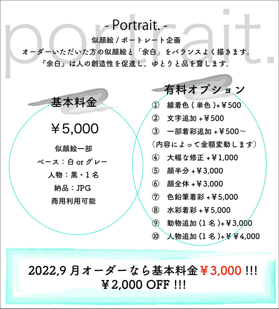 ✣ portrait ✣ 似顔絵企画 オーダーいただいた方の似顔絵と余白をバランスよく描きます 『余白』は人の創造性を促進し、ゆとりと品を齎します 基本料金¥5000を9月オーダーを頂いた場合¥3000とさせて頂きます coconala.com/services/24462… #ココナラ #イラスト #イラスト好きな人と繋がりたい