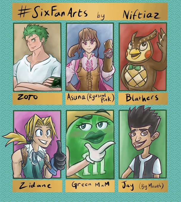 Heaps of good characters to #draw but in the end it came down to these choices, here's my first #SixFanarts challenge #Fanart #Drawing #OnePiece #Zoro #Ryusoulger #RyusoulPink #AnimalCrossing #Blathers #FinalFantasyIX #ZidaneTribal #MnMs #GreenMnMs #BigMouth #JayBilzerian